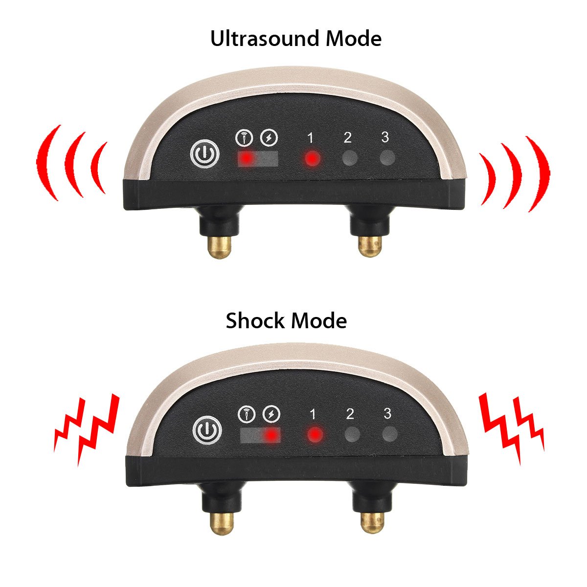 Electric Dog Training Collar with separate sound, vibration, and shock buttons, allowing for faster corrections instead of multiple button presses to switch between modes ultrasound, voice control, intensity adjustment.