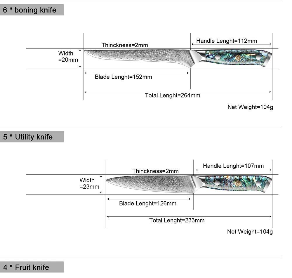 Then get the Damascus Steel Japanese Santoku Knives in your hand. Japanese Kitchen Knife Set is ideal for many kitchen tasks like slicing, mincing, chopping vegetables, slicing meat, and deboning lamb steak. We importance on quality craftsmanship, aesthetics, and detail, our target is to give you high-quality kitchen knives.