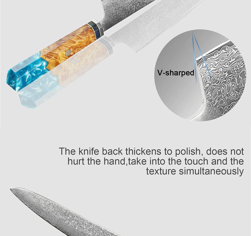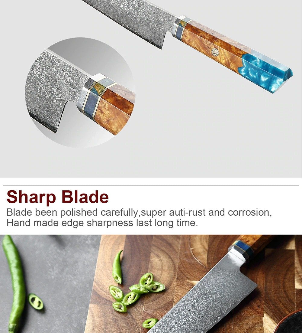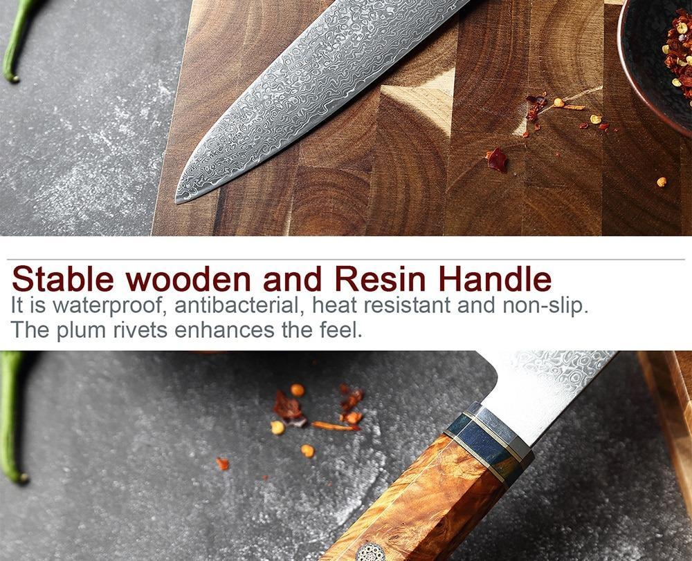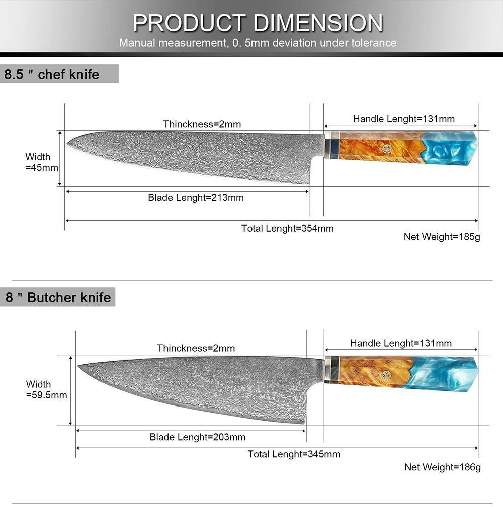 - Material : 67 layers of Damascus steel and first-class high-end touch. Damascus is naturally patterned, with amazing design and absolutely great materials to complete the kitchen task easily.